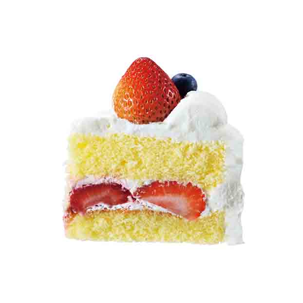 しっとりしたスポンジに生クリームと苺をサンド。トップには苺とブルーベリーをあしらったシンプルなケーキです。