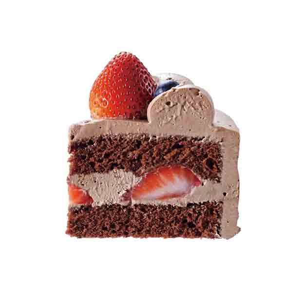 ショコラのスポンジにコクのあるショコラクリームと苺をサンド。トップには苺とブルーベリーをあしらったシンプルなチョコレートケーキです。