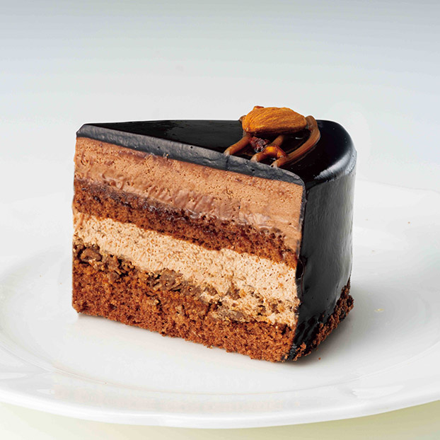 カカオ分69%のチョコレートを使用したショコラムース、ヘーゼルナッツショコラシャンティ、キャラメルソースを重ね、食感のアクセントにアーモンド、香りづけにコアントローを使用した贅沢なショコラケーキです。