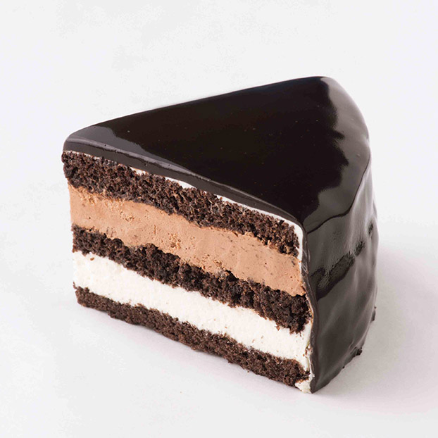 カカオ70%チョコとホワイトチョコの2層のムースを滑らかなチョコレートで仕上げました。