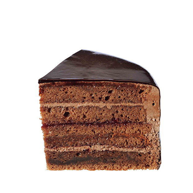 チョコレートスポンジにフランボワーズジャムとガナッシュチョコの3層をサンド。ピスタチオとフランポワーズの2種のマカロンで仕上げました。