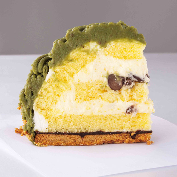 サブレ生地の上に、スポンジ、バニラクリーム、ザクザク食感が心地よいチョコチップも忍ばせて、上から抹茶モンブランクリームを絞りました。