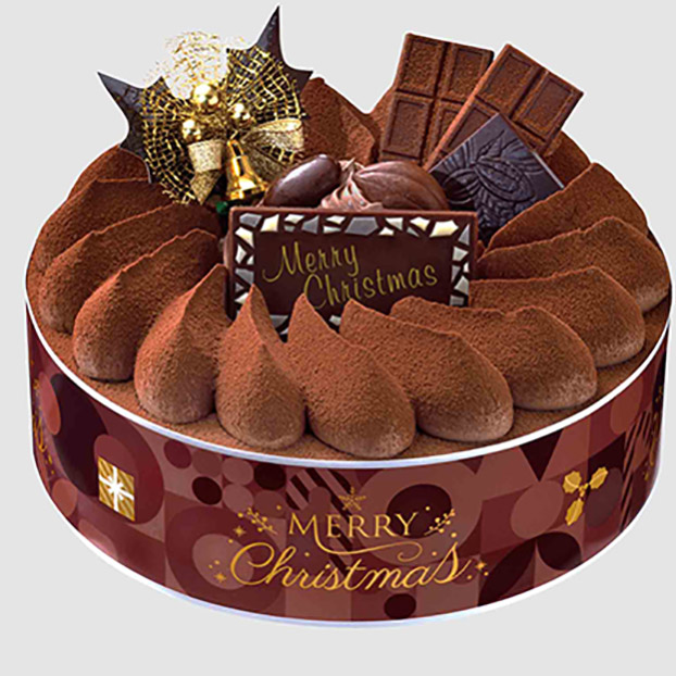 チョコチップとチョコクリームをサンドし、チョコをトッピングしたチョコづくしのクリスマスケーキです。