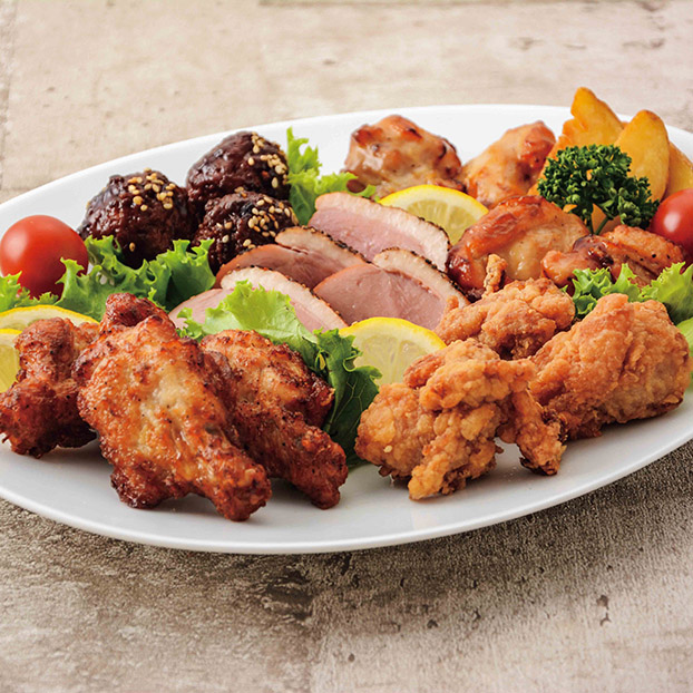 ローストチキン、あぶり焼きチキン、ふっくら肉団子、生姜香る鶏もも竜田揚げ、つくね、合鴨パストラミスライス、フライドポテト、レモン