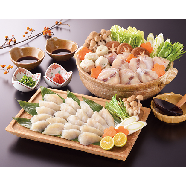 真ふく切り身300g、真ふくスライス100g、ふく入りつみれ×4、ふぐスープ500g、ぽん酢30ml×3、もみじおろし5g×3