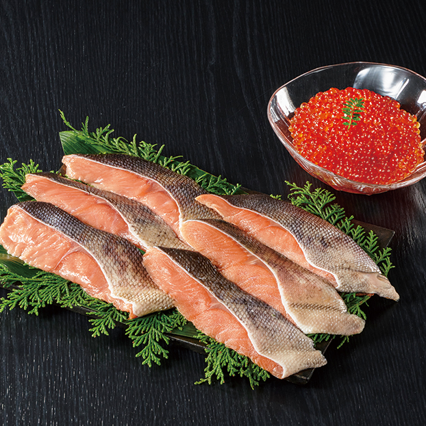 北海道の秋鮭はさっぱりした味わいが特長、いくらは秘伝の有機醤油タレに漬け込んで味付けをしています。