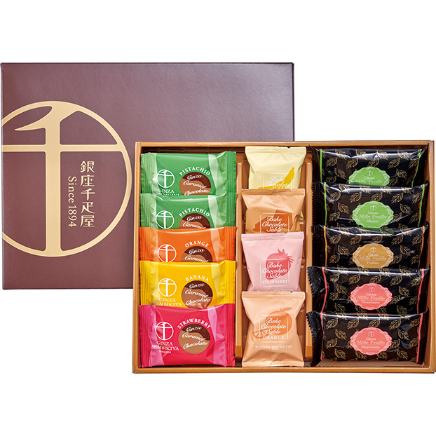 銀座ミルフィーユ(メロン・ストロベリー×各2、プラリネ×1)、銀座焼きショコラサブレ(オレンジ・ストロベリー・バナナ・キャラメル)×各1、銀座キャラメルショコラ(ストロベリー・バナナ・オレンジ×各1、ピスタチオ×2)