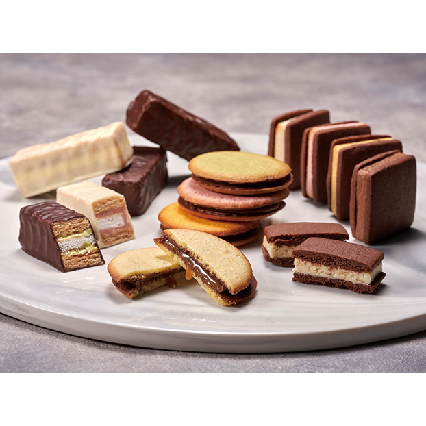 チョコレートでキャラメルを包み込みサンドした「キャラメルショコラ」。3種のクリームとメレンゲをチョコレートで包んだ「ミルフィーユ」。フルーツショコラをサンドした「焼きショコラサブレ」のセットです。