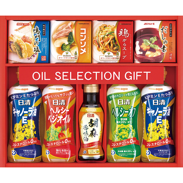 日清(ヘルシーオフ350g・ヘルシーべジオイル350g・キャノーラ油E350g×2・胡麻香味油145g)、鳴門の塩80g、マルトモだしの素(4g×6袋)、鶏がらスープ(20g×2袋)、コンソメ(20g×2袋)