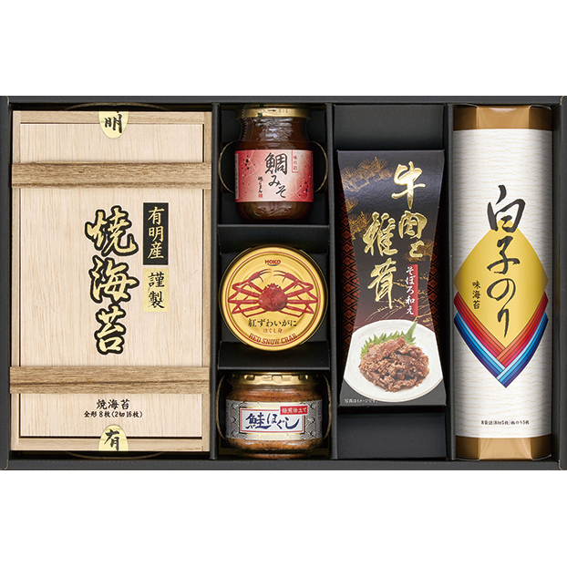 柳川海苔本舗有明産焼海苔(2切8枚×2袋)、白子のり味海苔(8切5枚×8袋)、磯じまん鯛みそ100g、牛肉と椎茸のそぼろ和え55g、宝幸紅ずわいがにほぐし身55g、鮭ほぐし40g
