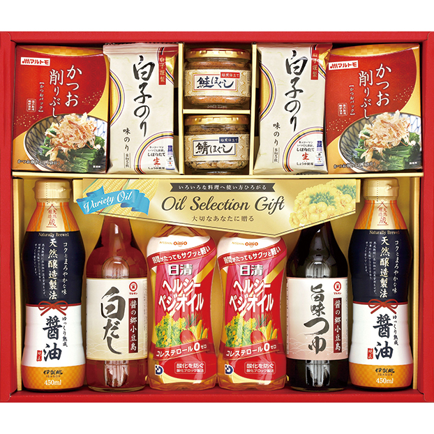 マルキン(旨味つゆ・白だし)各360ml、日清ヘルシーベジオイル350g×2、伊賀越天然醸造醤油450ml×2、白子味のり(8切5枚)×4、マルトモかつお削りぶし1.5g×4P×2、鮭ほぐし40g、鯖ほぐし40g