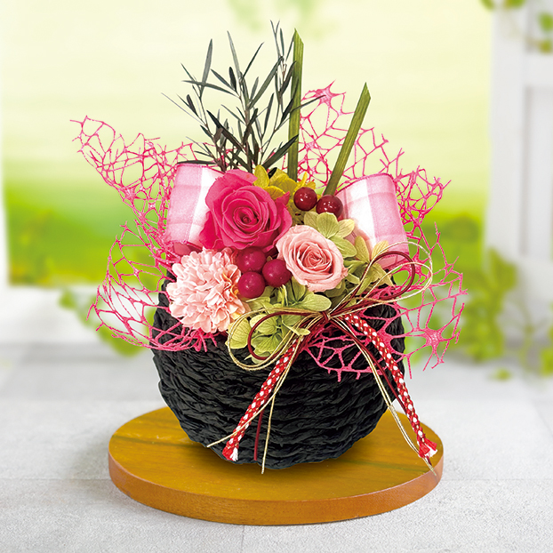 やさしいピンク色のプリザーブドフラワーを使用した、和の雰囲気を感じさせるバスケットアレンジメントです。