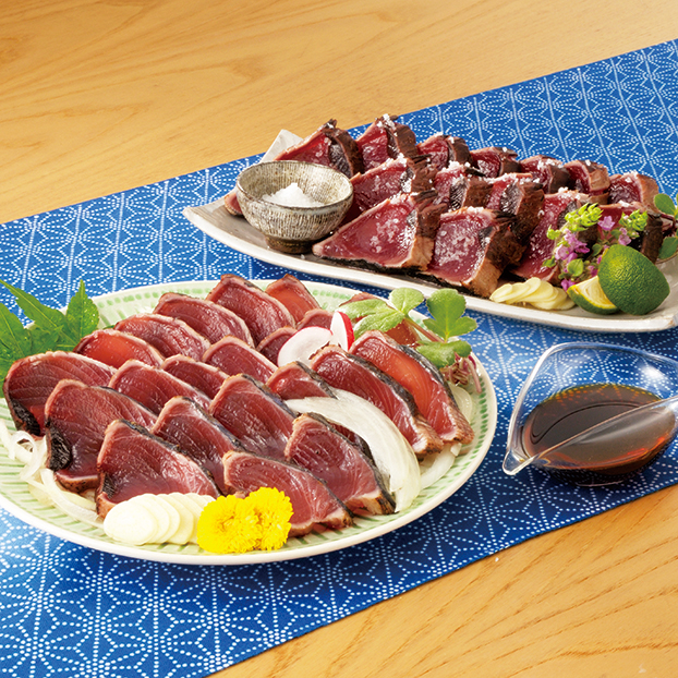 一本釣りで漁獲した鰹を土佐伝統の藁焼きでたたきにしました。ゆず風味のたれと天日塩で食べ比べできます。