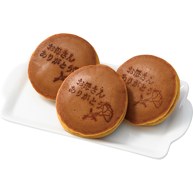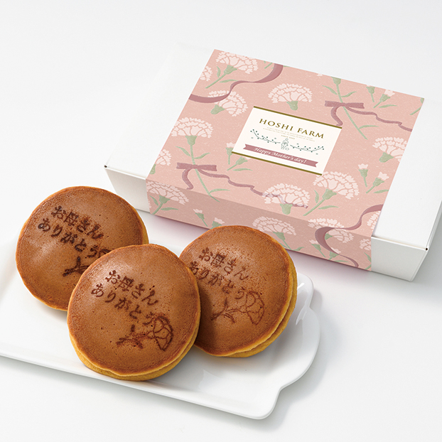 ふんわりやわらかく焼き上げた生地に、小豆あんと徳島産「なると金時」芋の角切りを入れたどら焼きとカーネーションのセットです。