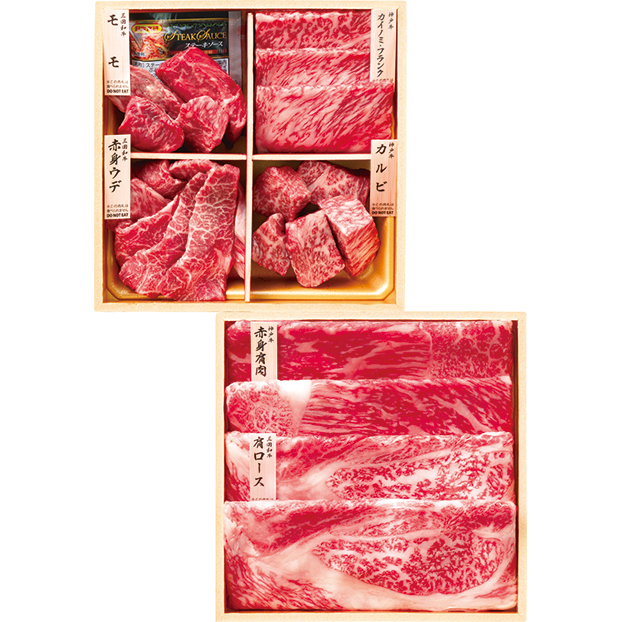 神戸牛(カルビサイコロステーキ64g、カイノミフランク焼肉用64g、赤身肩肉すき焼き用90g)、三田和牛(赤身ウデ焼肉用66g、モモサイコロステーキ66g、肩ロースすき焼き用90g)、ステーキソース20g
