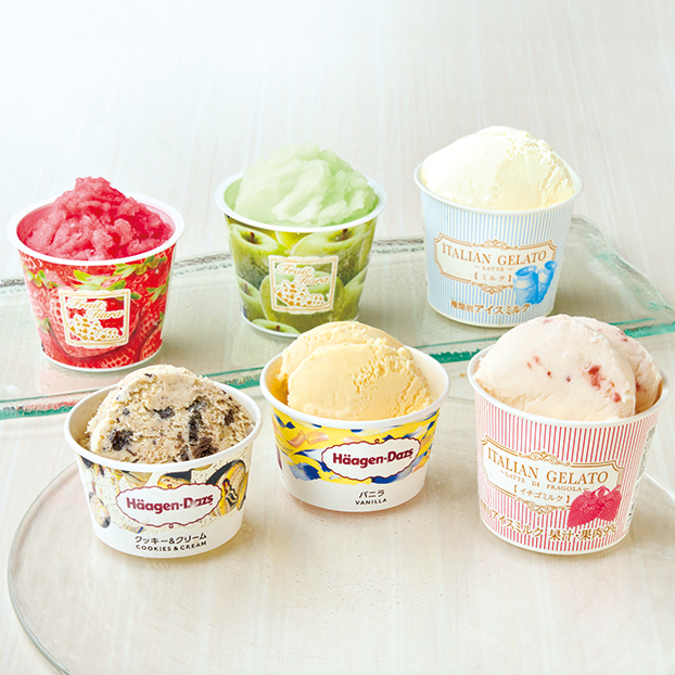 ハーゲンダッツラバーズアソート(バニラ・ストロベリー・クッキー&クリーム)各70ml×各2、KAMANARIYAイタリアンジェラート(ミルク・抹茶・苺ミルク各100ml×各1)、フルーツティアラソルベ(イチゴ・青リンゴ・パインアップル・ミカン各108ml×各1)