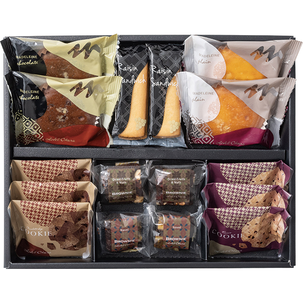 レーズンクッキー・チョコチップクッキー×各3、レーズンサンド・ブラウニー(ネーブル・ドライフルーツ&ナッツ)・マドレーヌ(プレーン・チョコ)×各2
